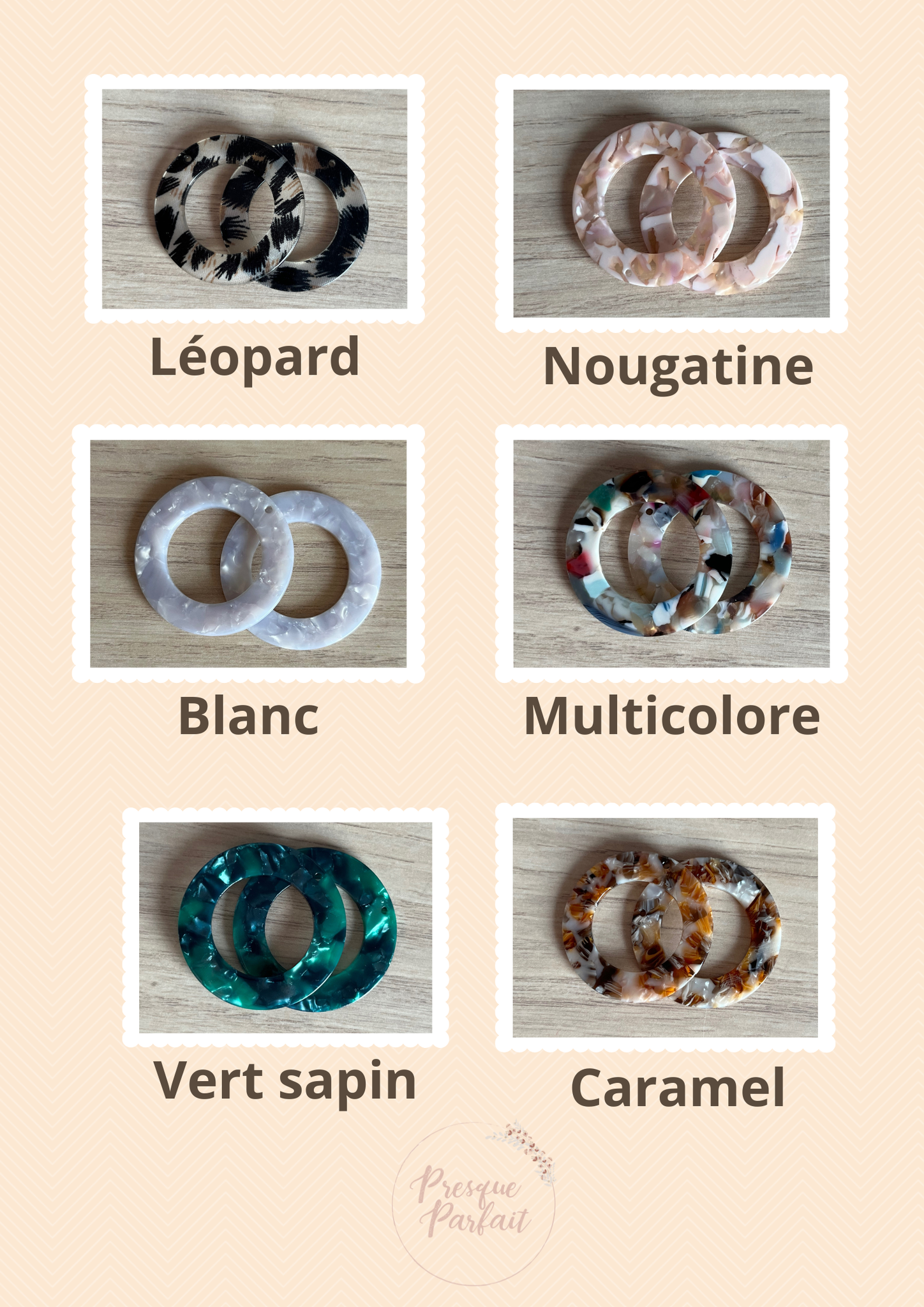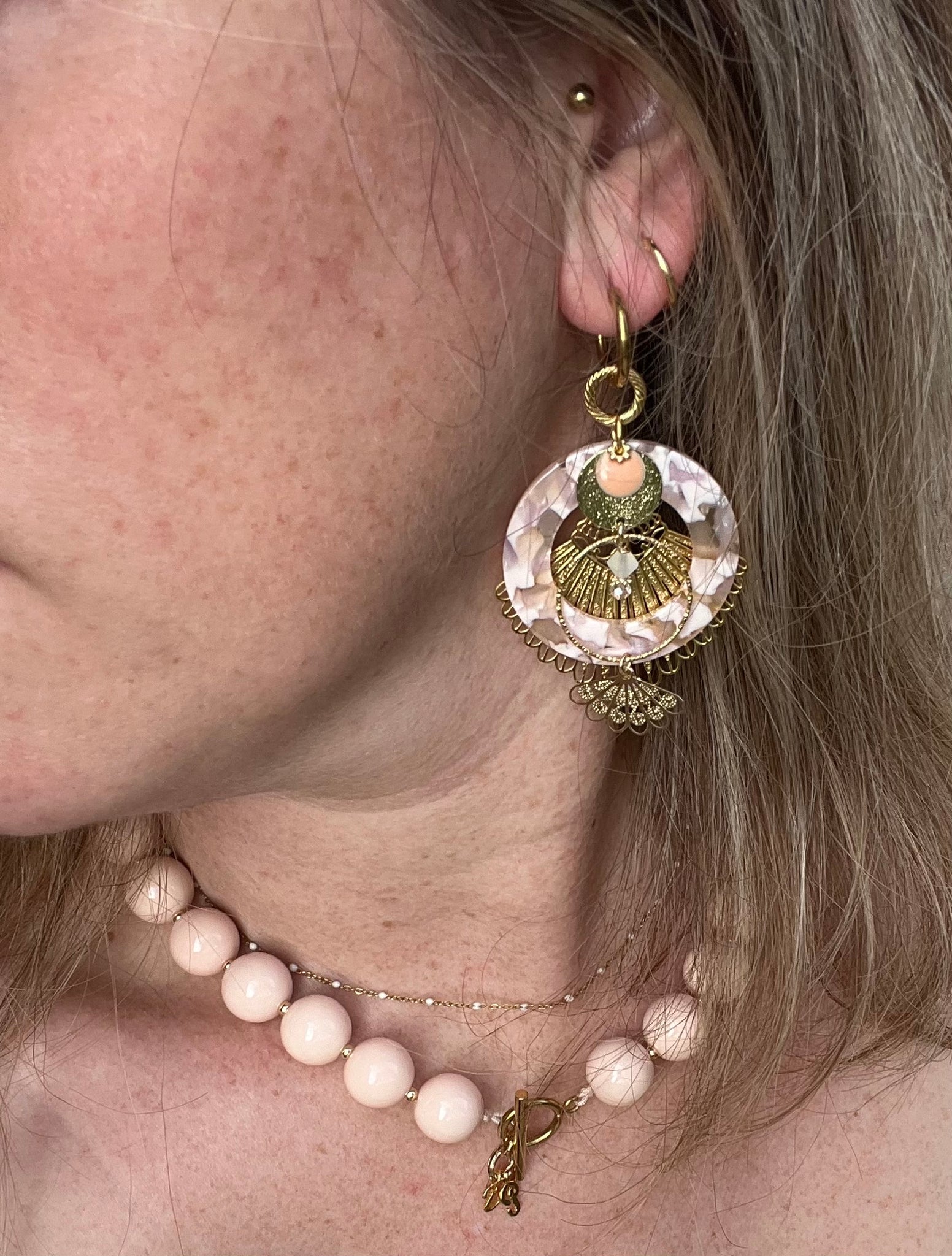 Une paire de boucles d'oreilles atypiques, mélangeant différentes formes et matériaux réhaussée d'une touche de couleur.