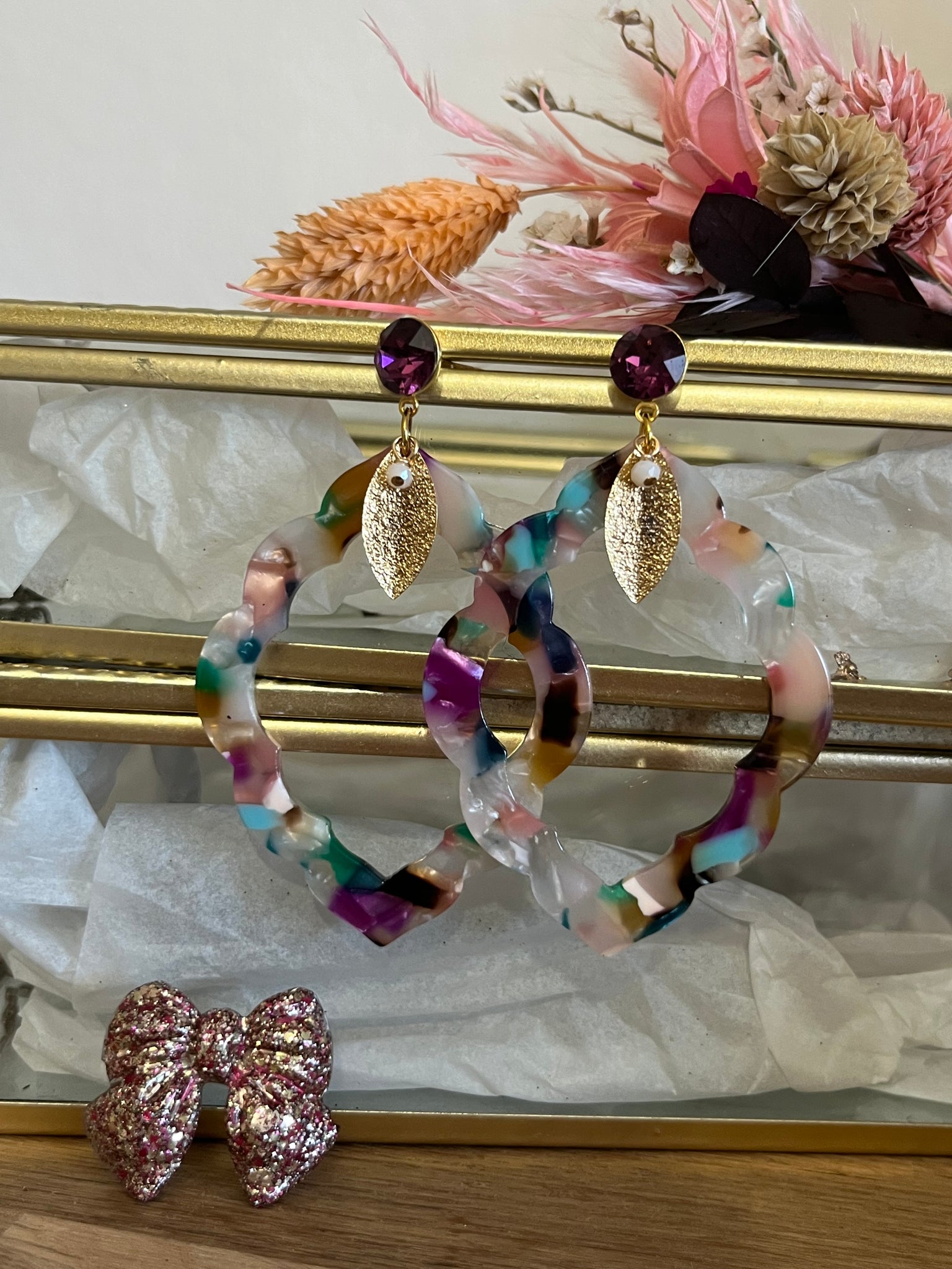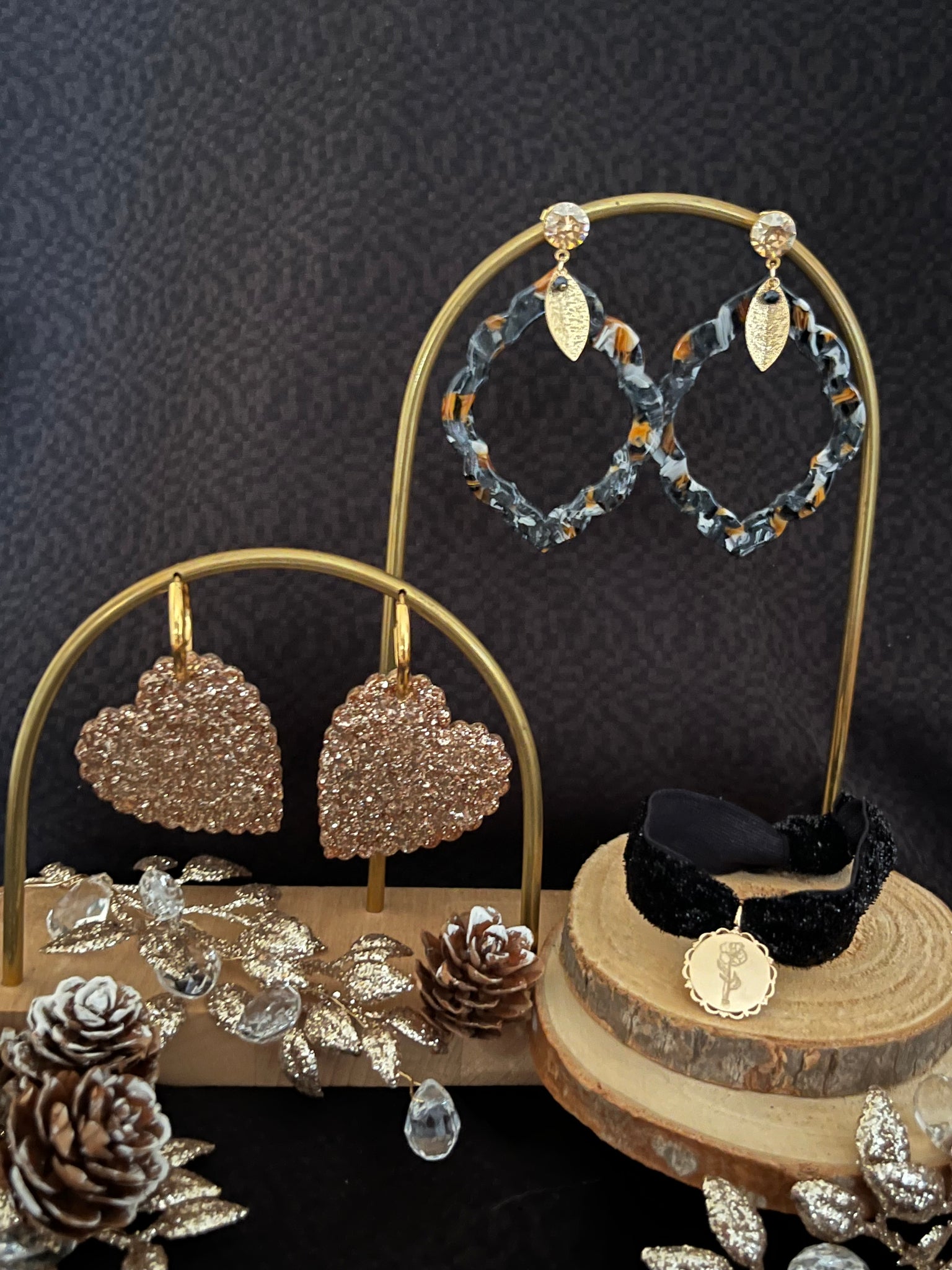 Une paire de boucles d'oreilles composées de différents matériaux donnant un équilibre parfait entre modernité et baroque.